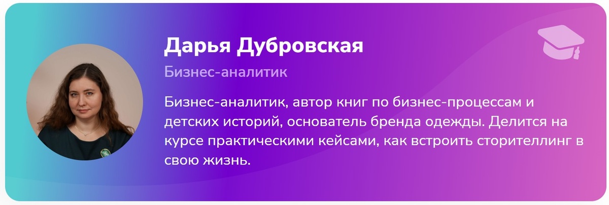 Автор курса: Дарья Дубровская — бизнес-аналитик, писатель, основатель бренда одежды. Делится практическими кейсами и учит внедрять сторителлинг в повседневную жизнь.