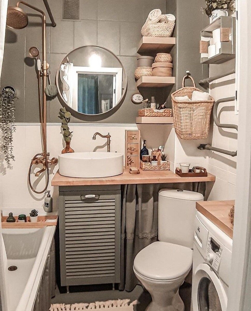 Проблема нехватки пространства в маленькой ванной комнате актуальна почти для всех. Но даже в скромных размерах можно создать удобную систему хранения, благодаря которой помещение станет функциональнее и уютнее. Вот несколько идей, которые помогут организовать пространство рационально. Пространство над дверью часто остается незадействованным. Установив здесь полку или навесной шкафчик, можно разместить запас туалетной бумаги, полотенца или банные принадлежности. Главное условие — высота расположения должна позволять свободно открывать дверь. Мы в ванной организовали две такие зоны - одна под всевозможные баночки в душевой кабинке, а вторая - ближе к двери. Угловая полка или компактный стеллаж идеально подойдут для размещения мелочей вроде шампуней, гелей для душа и кремов. Эти конструкции позволяют задействовать неиспользуемые уголки помещения, освобождая рабочую поверхность столешницы. Для хранения туалетной бумаги в угол поставили вертикальную стойку, на которую удобно ставятся 5-6