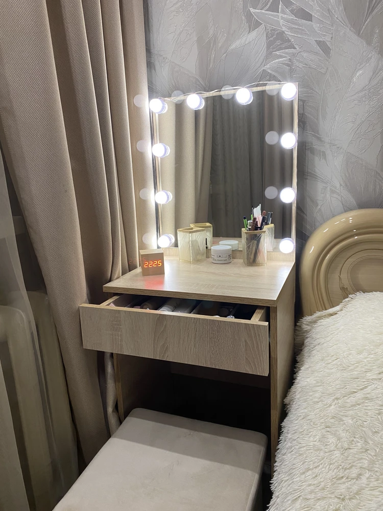 Решила обновить обстановку в спальне и выбрала туалетный столик от производителя "Кео". Раньше мучилась с маленьким зеркальцем и кучей баночек на подоконнике, а тут — красота! Большое зеркало помогает идеально наносить макияж. Выдвижной ящик удобен для хранения косметики и аксессуаров.