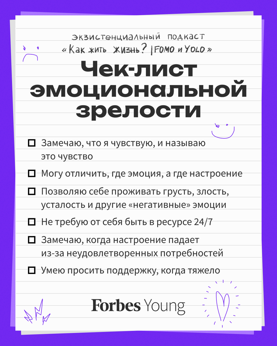 Почему наше настроение так переменчиво? Как отличить грусть от депрессии? Почему важно проживать эмоции, а не прятать их за маской самообладания? И как научиться слышать свои потребности, чтобы не застревать в плохом настроении? «Есть три зоны осознавания: внутренняя — это телесные ощущения; средняя — наши мысли; и внешняя — это как раз-таки эмоции, то есть реакция организма на что-то происходящее вовне. <...> Фишка полной взрослости — в этом триединстве. — объясняет психолог и гештальт-терапевт Наталья Спесивцева. — Это называется целостность. Когда я осознаю, что я сейчас ощущаю, что я на этот счет думаю и какие эмоции я при этом испытываю». Во втором выпуске третьего сезона подкаста «Как жить жизнь? | FOMO и YOLO» обсуждаем, как связаны эмоции, настроение и взрослость. А пока слушаете, попробуйте заполнить чек-лист: проверьте, насколько хорошо вы понимаете свои эмоции и настроение. Слушайте выпуск прямо сейчас: • на сайте Forbes • в Apple Podcasts • в Яндекс Музыке • в Te