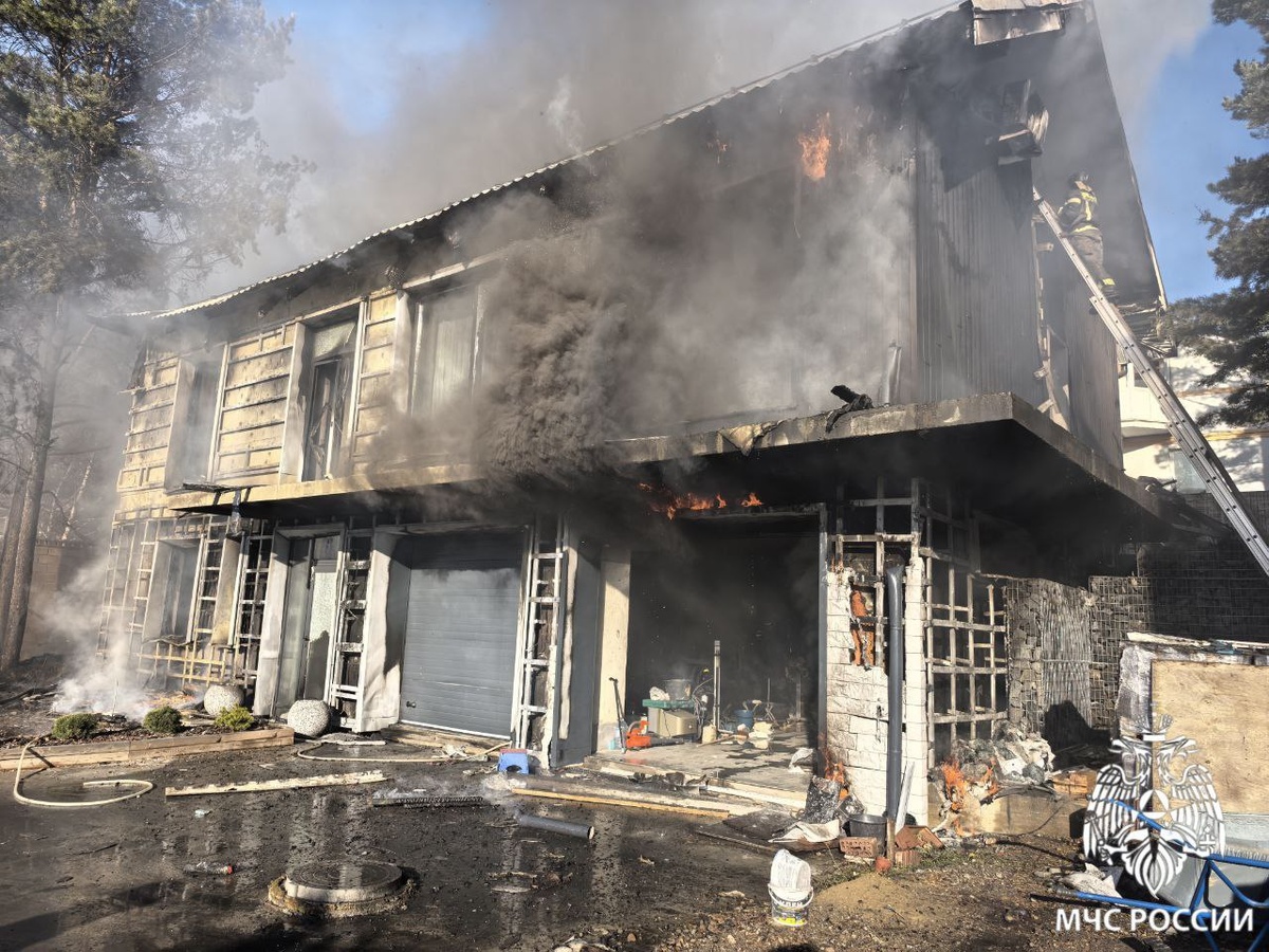 В микрорайоне "Ершовский" города Иркутска сотрудники МЧС России тушат пожар, охвативший жилой дом и баню
