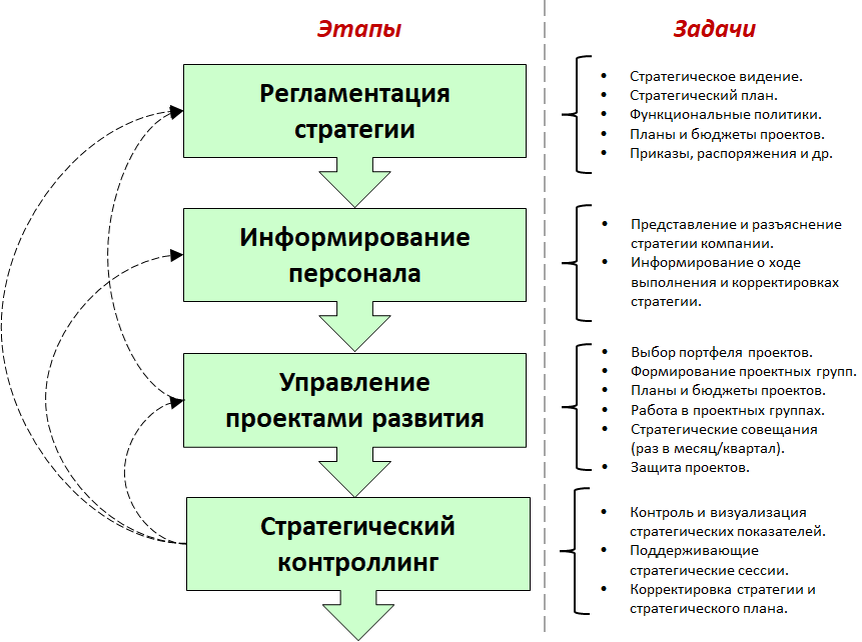 Олег Кулагин Друзья, приветствую вас! Итак, предположим, что все необходимые условия для реализации стратегии мы создали или по крайней мере начали создавать, а именно: Чего же боле? Дело за малым. Теперь для достижения успешного успеха надо задействовать управленческие рычаги, которые непосредственно приводят стратегию в движение и переводят ее из красивых картинок на флипчарте в практическую плоскость реальных организационных изменений. Таких рычагов по-крупному всего четыре. Их можно рассматривать как этапы реализации стратегии, хотя строгой линейной последовательности здесь нет, ибо всегда в этом процессе приходится возвращаться на шаг (или более) назад, чтобы сделать два (или более) шага вперед. Реализация стратегии – процесс тернистый, непредсказуемый и нелинейный. К ним относятся: 1. Регламентация стратегии. Стратегические решения о целях (куда?) и проектах (как?) следует «забетонировать» (хотя бы временно) в официальных документах, обязательных для исполнения. Это могут быть та