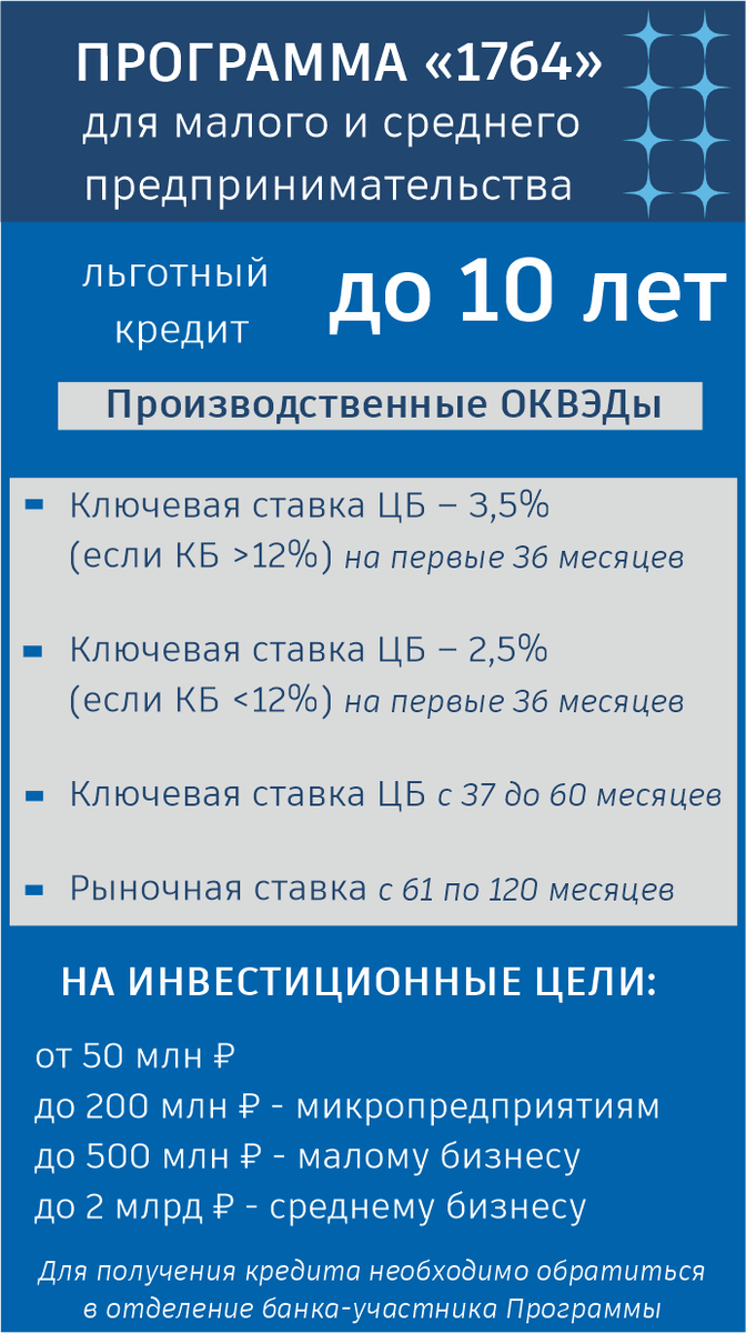 Продолжаем рассказывать о мерах господдержки бизнеса! «1764» — это государственная программа льготного кредитования малого и среднего бизнеса (МСП) в России. Она предоставляет кредиты на инвестиционные цели по сниженным процентным ставкам. Программа реализуется в рамках национального проекта «Малое и среднее предпринимательство».