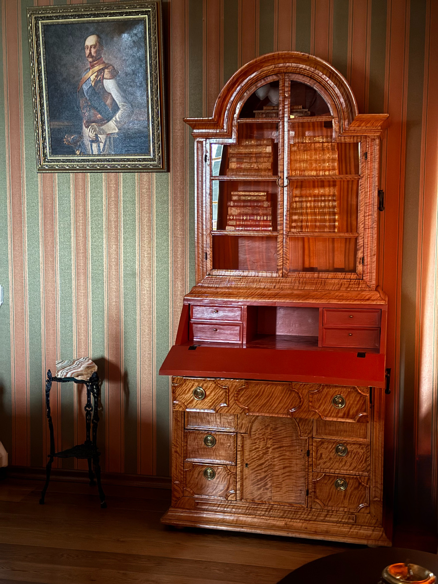 Форма шкафа из коллекции музея-заповедника отличается рациональностью и гармоничными пропорциями. Он состоит из трех функциональных ярусов: верхней витрины со стеклянными дверцами, откидной письменной поверхности и нижнего комода с выдвижными ящиками и центральной распашной дверцей, закрывающейся на ключ. Внутри, за откидной крышкой, скрывается конторка с четырьмя выдвижными ящичками. На боковых поверхностях шкафа размещены металлические ручки – они облегчали перемещение этого громоздкого предмета в пространстве.