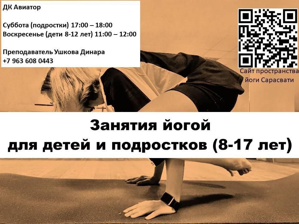 ✨ НОВОСТИ. Пространство йоги Сарасвати приглашает на свои занятия:🧘 - детей в «среднюю» группу (8-12 лет) и - подростков (13-17 лет). Как и со взрослыми, но, конечно, с поправкой на возраст, юных практикующих мы обучаем: - Физическим упражнениям - Основам дыхательных техник - Практикам расслабления и концентрации. Занятия проходят в уважительной, дружелюбной, неспешной манере. Занятия проводит сертифицированный преподаватель йоги для детей Ушкова Динара. По всем вопросам обращаться к Динаре по телефону +7 963 6080443. Будем рады видеть Ваших детей и подростков на занятиях. 🏢 Городской дом культуры «Авиатор» 📍 г. Домодедово, ул.Гагарина, д.1 ✅ Мероприятия Домодедово https://dzen.ru/id/66f10385cc4c5a16f7b5fb02 http://vk.com/domodedovo_events http://dzen.ru/domodedovo_events