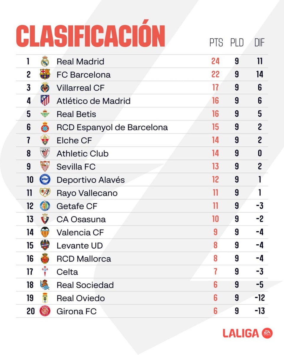 Турнирная таблица 🇪🇸 LALIGA по итогам 9-го тура