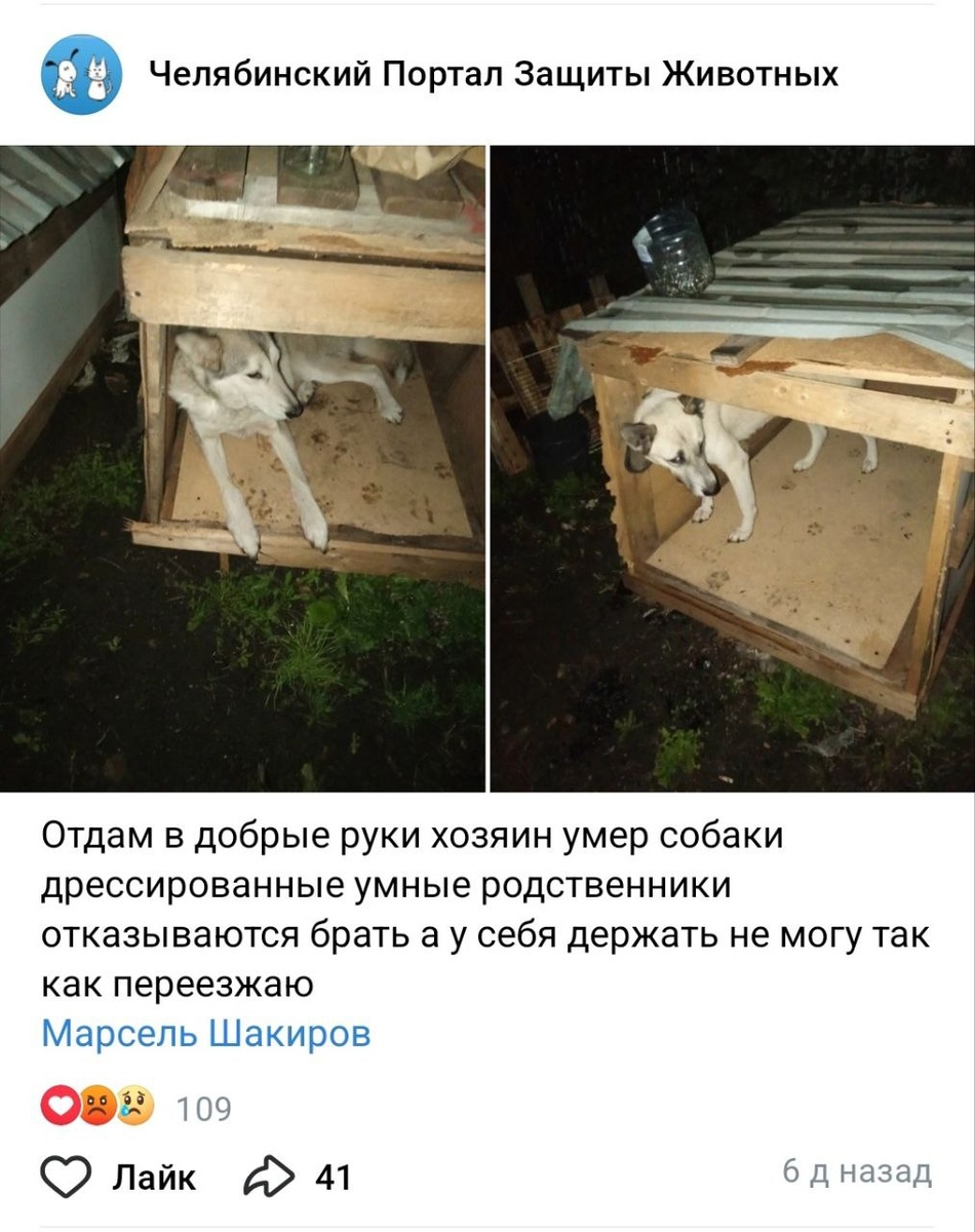 Вот и выяснилось откуда в поле привязанные "умные и дрессированные собаки" Хозяин умер,сразу все на луну переезжают.Кто то наследство прихватил ,а кто то просто отправил собак в путешествие по "миру". С глаз долой ,из сердца вон.. А вы спрашиваете откуда столько бездомных животных.Можно уже смело говорить,что количество умерших за месяц людей равно количеству новых бездомных животных. Я не верю в наказание законами,но очень верю в кару Божью и надеюсь хозяева таких животных с того света запускают "лучи добра " и кидаются бумерангами в таких родственников. Тема https://vk.com/wall-14533322_1298755 Марсель Шакиров такой молодой и такой гад... Забрали говорит у него собак уже..