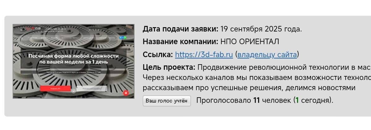 Поддержите будущее без долгого ожидания отливок! Участвуем в конкурсе на "Лучший интернет-проект 2025 года среди металлургических и металлоторговых компаний России и стран СНГ". Наш сайт — единственный в направлении 3D-печати для литейных производств. Готовимся сорвать приз зрительских симпатий! Голосуйте за 3D-FAB по ссылке Для голосования не нужна регистрация. Нужно зайти в раздел «Партнеры» и нажать кнопку «голосовать» напротив компании НПО Ориентал.