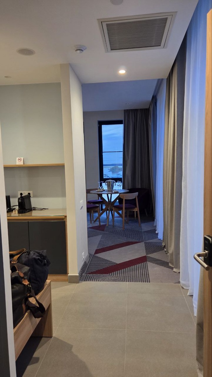 Маленькая прихожая и шкаф по левую руку. Напротив гостевого туалета кухонная зона с холодильником и чайно-кофейной станцией. Угловая гостиная с видом на реку, лес на горизонте и розовый закат. Все необходимое в наличие – мягкий диван, большой телевизор, рабочий столик, обеденная зона и приятный комплимент от отеля – макаруны и кубанское игристое 🥂 #рябина