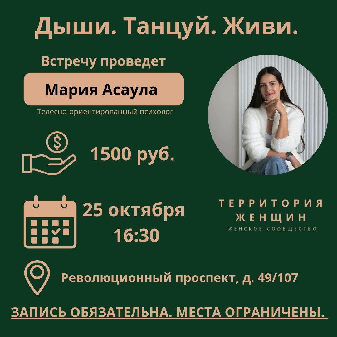 ✨ ДЫШИ. ТАНЦУЙ. ЖИВИ. Гармония через движение 🧘 Что вас ждёт: 🔹Дыхательные практики 🔹Танцевально-двигательная терапия 🔹 Поддержка профессионального психолога Количество мест: осталось 4️⃣! Освободите тело и душу через движение! 💫 Запись ✍️ https://t.me/asaula ✍️ https://t.me/womensrealm 🚫 Возраст: 18+ 📆 25.10.2025 🕒 16:30 🏢 Ре-форм фитнес центр 📍г. Подольск, Революционный проспект, 49/107 💰 Цена: 1500 ₽ ⭐Поддержать канал голосом ✅ Мероприятия Подольск https://dzen.ru/id/66ed500f7b5671493eca3fd6 http://vk.com/podolsk_events http://dzen.ru/podolsk_events