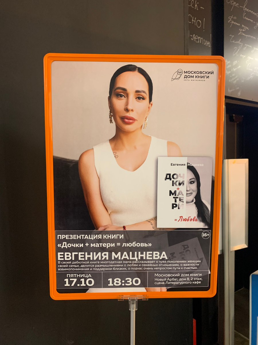 Как вы знаете, друзья мои, я — травматик, выросший в семье, где редкий день обходился без ссоры, а редкое застолье — без скандала. Может быть, именно поэтому я очень люблю саги о нескольких поколениях. Истории семей, где дочки, матери, сыновья, отцы и другие родственники поддерживают друг друга, а не бьют в спину. Дебютная книга Евгении Мацневой «Дочки + матери = любовь» — именно об этом. О любви, которая передаётся из поколения в поколение. Презентация книги прошла в «Московском Доме Книги» на Новом Арбате. Выступлению Евгении предшествовала презентация о её книге, в которой отразились судьбы женщин трёх поколений: бабушки, её дочери и внучки. Старшая из женщин родилась после войны. Это человек того поколения, где счастье надо было долго и тяжело заслуживать. Лучше, чем на этом стенде, и не скажешь: Дочь этой женщины — человек, чья юность пришлась на 1980-е — 1990-е годы. Переломная эпоха, требующая сильных людей. Поколение Х 1965-1980 годов рождения, которым я восхищаюсь, это про