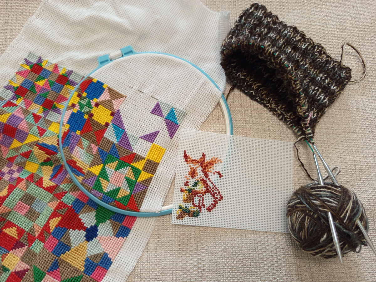 Продолжаем продвижения моих проектов. На прошлой неделе был большой прирост по белочке и не было совсем по платью, а ведь и морозы не за горами. Ступор по платью произошёл из-за того, что надо сесть и посчитатьпетли, поделить на реглан, насчитать росток, и начать вязать. И тадамм, у меня наконец-то нашлось это времечко. Поэтому платья сделало большой рывок вперед. Было воротник резинка 2*2. Стало Виден вывязанный росток и видны линии реглана. Прошла первый этап ломаного реглаа, сейчас вяжу второй. Поэтому скорее всего и приросты будут неплохие. Будем ждать. Вышивка подушки тоже хромала на прошлой неделе, и прирост был минимальный и ошибочный. Вместо квадратного блока 7*7 крестиков, вышился блок 7*8 и поэтому произошло минимальное смещение, и блок чуток отличается от схематичнного, но в такой вышивке и не заметно, если не знать, поэтому роспуска не было, а прирост был. И даже не плохой прирост я бы сказала. Блок закрылся граниями и сейчас вышиваться будет серединка. Будем ждать финиш