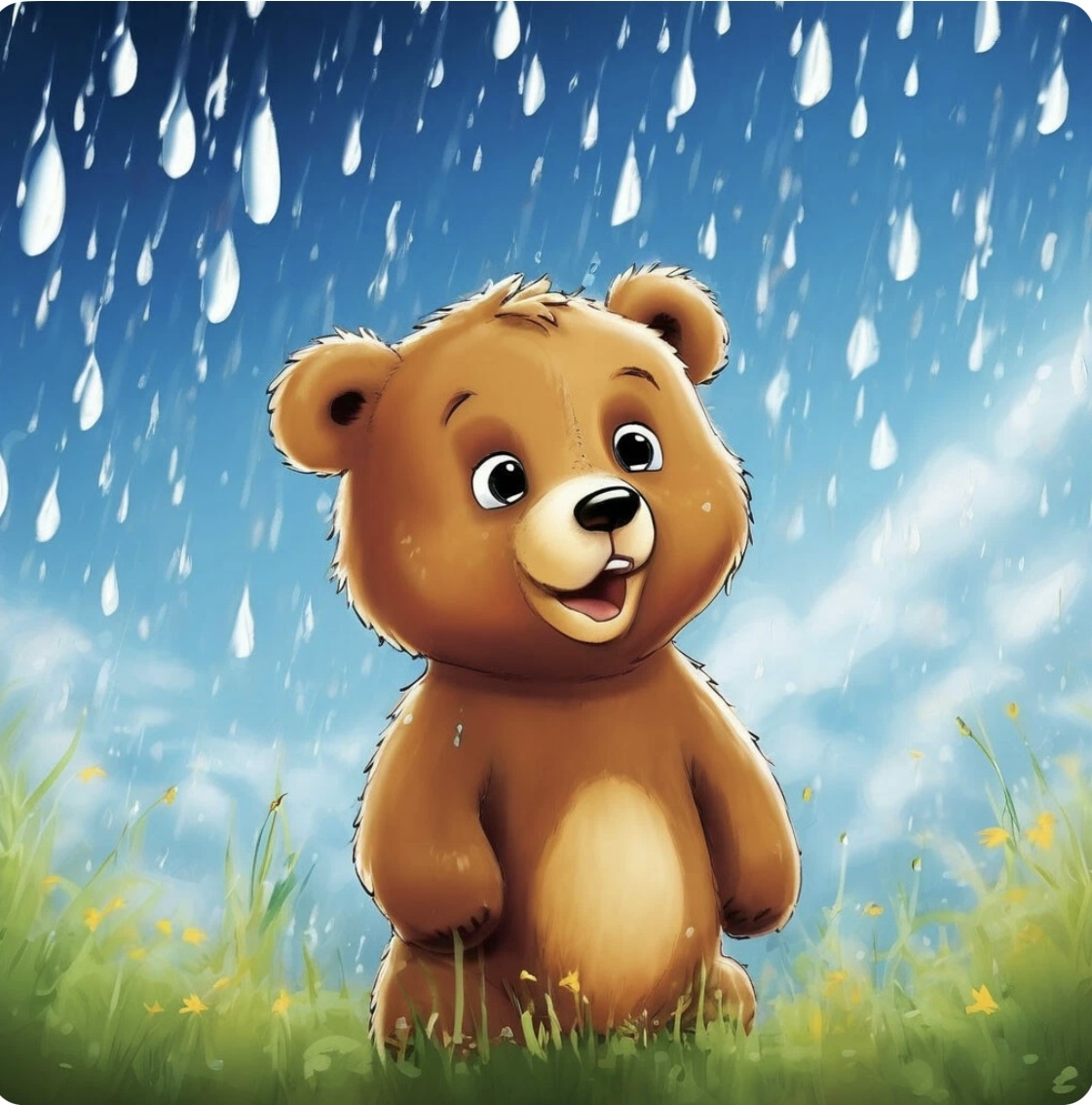 В густом лесу, где по утрам пахло мёдом и тёплой землёй, жил маленький медвежонок по имени Барри. Он был любознательный, но немножко упрямый. Всё хотел делать по-своему и не любил, когда кто-то учит его или советует. Каждый день Барри находил себе приключения: то пытался построить плот, не зная, что такое течение, то решил вырастить конфетное дерево, закопав леденец. Но однажды случилось нечто странное — небо потемнело, и пошёл… волшебный дождь. Капли этого дождя были разноцветными — розовыми, синими, золотыми. Они падали тихо, но от каждой капли в лесу что-то менялось: куст становился выше, пень начинал мурлыкать, а лужи светились, будто в них спрятались звёзды. Барри заворожённо поднял лапу — на неё упала золотая капля. — Ой! — сказал он. — Какая тёплая и… пахнет пирогом! Рядом стояла мудрая Сова. — Осторожнее, Барри. Волшебный дождь исполняет не слова, а намерения. — А что это значит? — нахмурился медвежонок. — Это значит, что он слышит не то, что ты говоришь, а то, что у тебя в сер