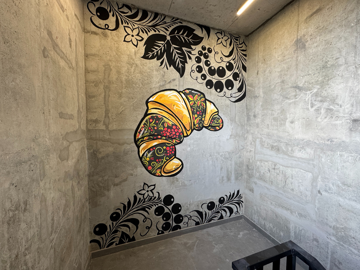 Работа для первого пищевого технопарка в России - задача весьма нестандартная. Нужно было оформить лестничные пролеты в стильном, но брутальном лофте, подчернкув направление деятельности самого Технопарка. Наше решение: Два стиля — одно пространство. Первая стилистика - хохломская роспись. Мы взяли популярные мировые блюда - роллы, круассан, бургер ( и другие ), сделали их яркими, но в форму и цвет добавили узнаваемую народную роспись -хохлому, которая проявляется в рисунках. Главный символ — ягоды рябины, отсылающие к самому названию «Рябиновая». Это был тонкий намек на миссию технопарка: взять лучшие мировые тренды и переосмыслить их через призму российских возможностей. В качестве фонового элемента, мы использовали ту же традиционную хохломскую роспись, но в монохроме, чтобы подчеркнуть общую тематику и сделать качественное сочетание со стилистикой лофт. Вторая стилистика - Лофт-графика. Контурные рисунки еды, в сочетании с плавными геометрическими линиями, создают современный инду