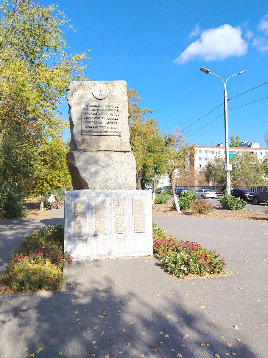 Он находится на улице имени Кирова, между лицеем №10 и школой №56. Был открыт в начале 1990-х годов. 28 мая 1939 года японцами было начато наступление на советско-монгольские войска в районе реки Халхин-Гол. В СССР была объявлена мобилизация, и очень много парней из Сталинграда попало в Монголию. Первые месяцы конфликта были для нас неудачными. Но к концу августа, перейдя в решительное наступление, наши бойцы окружили противника. Утром 31 августа 1939 года судьба японской боевой группировки была предрешена, и Японией был подписан акт о полной капитуляции. Халхин-Гол стал началом карьеры легендарного советского маршала Георгия Константиновича Жукова как полководца. Прежде не очень известный командующий дивизией после победы над японцами возглавил самый крупный в стране Киевский военный округ, а после стал руководителем Генерального Штаба. Монумент представляет собой бетонный пьедестал, по периметру которого находятся мемориальные плиты с именами погибших во время конфликта сталинградц