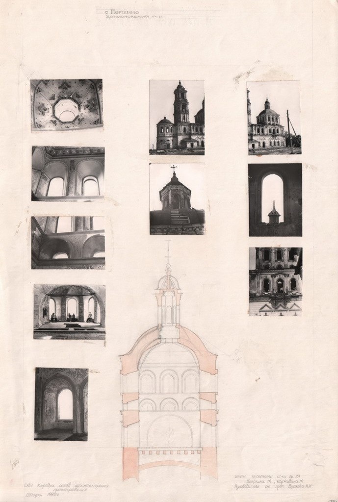 По притокам реки Исеть (Церкви). Материалы обмерной практики. Лист 13. Церковь с. Першино. Фотографии, разрез | 1980 г.