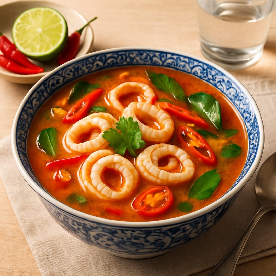 Острый том-ям с кальмарами Ингредиенты ⤵️ 🔸 Кальмары – 400 г 🔸 Бульон рыбный – 1,5 л 🔸 Лемонграсс – 2 стебля 🔸 Листья кафр-лайма – 4 шт. 🔸 Имбирь свежий – 3 см 🔸 Перец чили свежий – 2 шт. 🔸 Шампиньоны – 150 г 🔸 Помидоры черри – 100 г 🔸 Лайм – 1 шт. 🔸 Соус рыбный – 3 ст.л. 🔸 Паста том-ям – 2 ст.л. 🔸 Кинза свежая – ½ пучка 🔸 Масло растительное – 1 ст.л. Приготовление🦑 1. Кальмары нарезать кольцами. Лемонграсс нарезать кусочками, имбирь пластинами, чили кольцами. 2. В кастрюле разогреть масло, обжарить пасту том-ям 1 минуту. Добавить лемонграсс, имбирь и чили, готовить ещё 1 минуту. 3. Влить бульон, добавить листья кафр-лайма. Варить 10 минут на среднем огне. 4. Добавить шампиньоны и помидоры черри, варить 5 минут. 5. Добавить кальмары, варить 2 минуты до сворачивания. 6. Влить рыбный соус и сок лайма, перемешать. 7. Снять с огня, посыпать кинзой и подавать. Рецепт дня #том_ям #кальмары #морепродукты #тайская_кухня #суп #обед