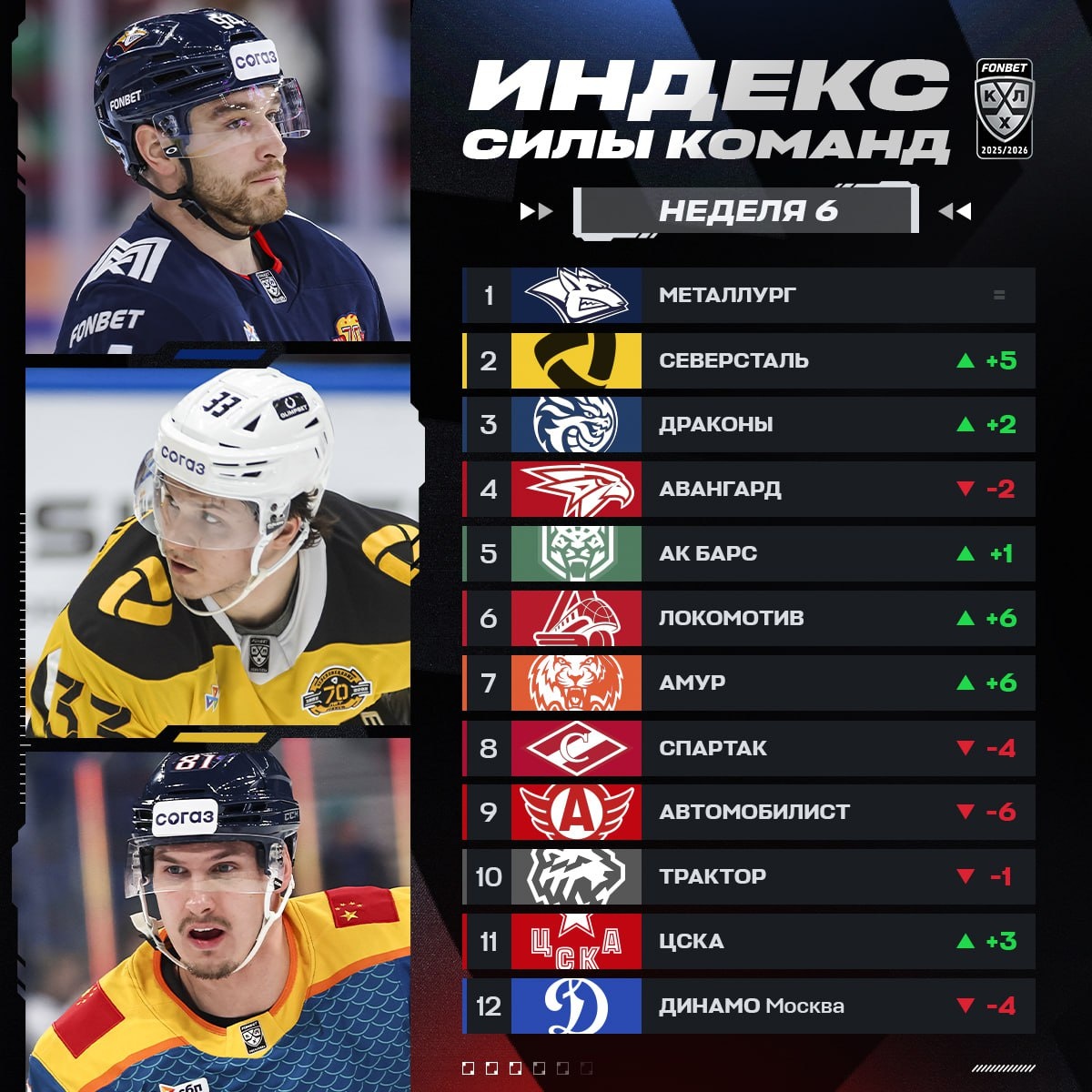 «Северсталь» и «Драконы» присоединились к «Металлургу» в топ-3 нового Индекса силы команд. Индекс силы – это рейтинг, подсчитывающийся математически на основе показателей в текущем сезоне. Индекс силы показывает, какие команды в настоящий момент находятся «на ходу», обыгрывают фаворитов и выдают длительные победные серии (за победу в основное время одна команда отнимает у другой 25% её баллов, в случае победы в овертайме или по буллитам — 12.5%).