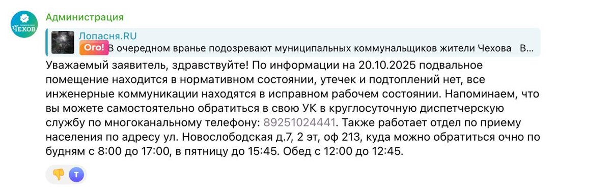 Жители дома №19 по улице Весенней в Чехове в отчаянии. После многочисленных жалоб на затопленный фекалиями подвал, они получили официальный ответ от администрации городского округа, который вызвал у них бурю негодования. В документе утверждается, что подвальное помещение находится в "нормативном состоянии", без утечек и подтоплений, а все коммуникации исправны.