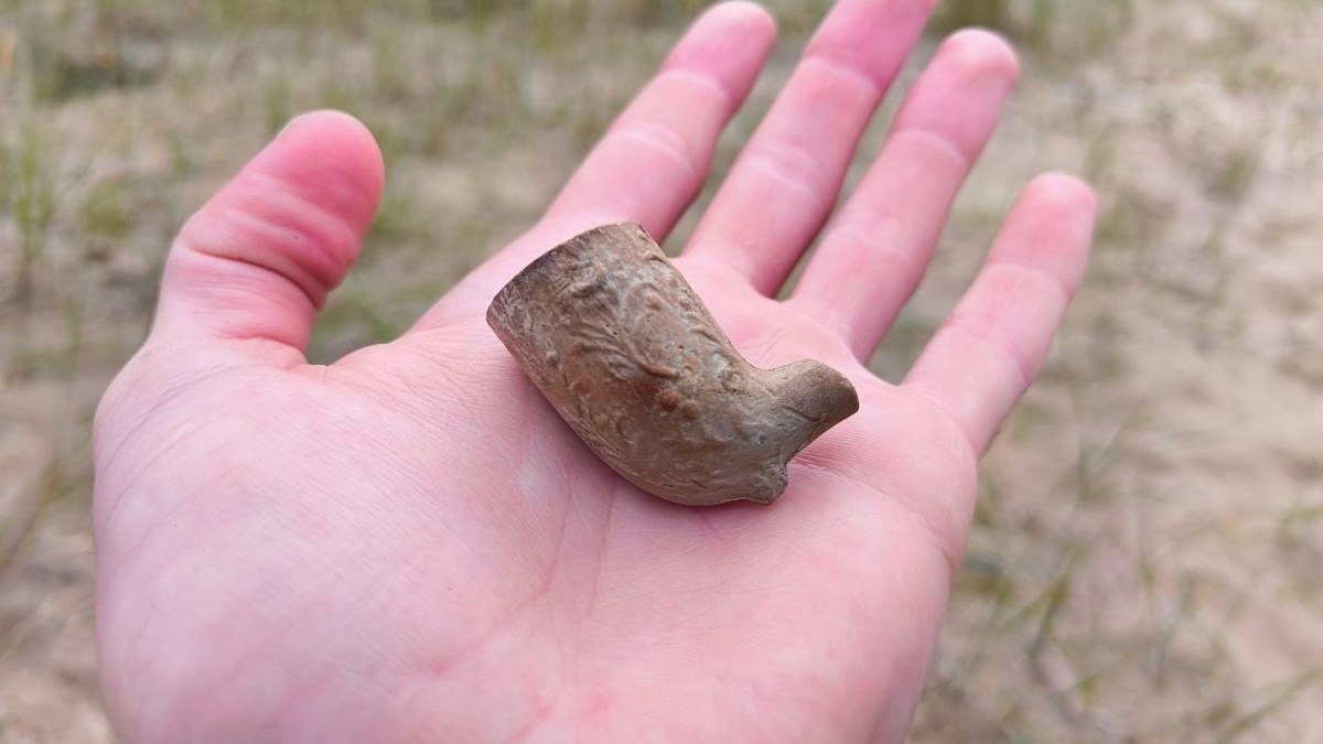 «Судя по всему, выполнен из глины и имеет малый вес а так же неравномерную толщину стенок будучи полым внутри. Так же сквозное отверстие в горловине которое сквозит в полость. По центру видно продольную линию из за которой я делаю вывод что свисток если он им является был сделан из двух частей. По длине и ширине приблизительно 5 см и 3 см соответственно. Часть откололась ещё до обнаружения, местами виднеется оранжевый глиняный оттенок», — сообщает наш подписчик Daniel Dvil [Фото 1-4]. Отвечает археолог Павел Колосницын: «Это курительная трубка так называемого голландского типа. Подобные трубки изготавливались первоначально в Голландии (преимущественно в городе Гауда) с 17 века. Они имели небольшую колоколовидную чашку и длинный тонкий мундштук. Ещё один характерный признак — выступ под чашкой. Первоначально он был функциональным — на нем трубка стояла когда её опирали на стол, чтоб раскалённая чашечка не портила его. Позднее стал частью декора. Подобные трубки были довольно хрупкими и