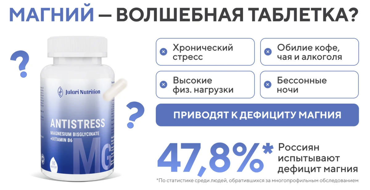 Эти, казалось бы, разрозненные симптомы часто имеют одну общую причину — дефицит магния. Магний участвует более чем в 300 биохимических реакциях в нашем организме, но, по статистике, до 80% населения испытывает его нехватку.