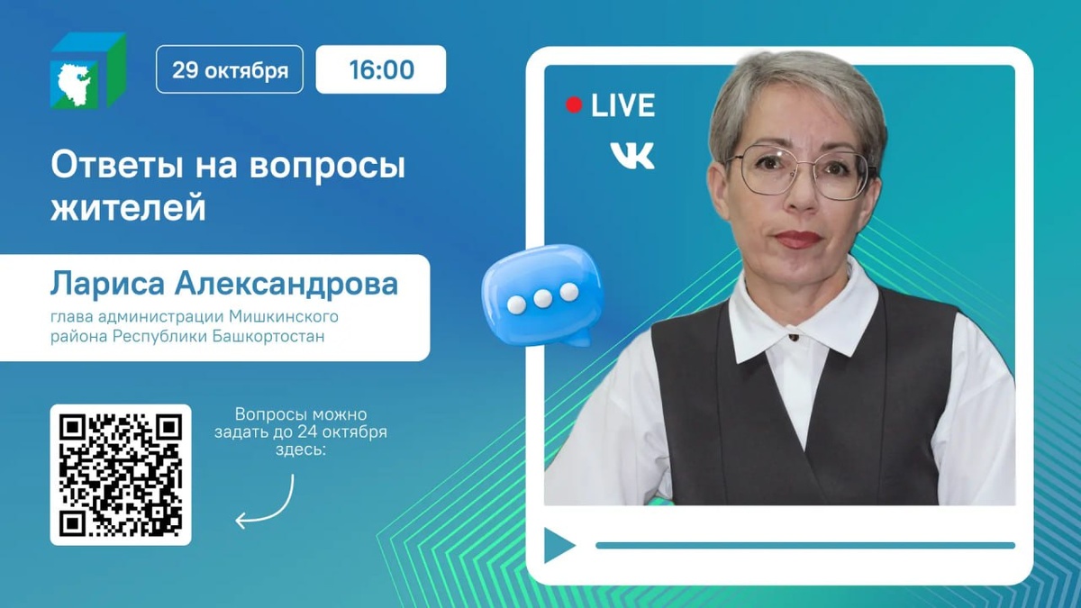 На вопросы жителей ответит глава Мишкинского района Лариса Александрова. Прямой эфир – в Центре управления республикой 29 октября в 16.00. Это возможность напрямую задать вопросы главе района и получить исчерпывающую информацию о планах благоустройства, ремонте дорог, развитии инфраструктуры и других темах, волнующих мишкинцев. Вопросы можно задать заранее, воспользовавшись специальной формой на портале Госуслуг https://pos.gosuslugi.ru/lkp/direct-line/10383/ 💚 ЦУР Башкортостана