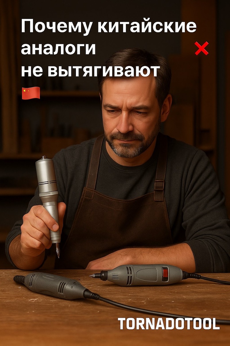 Почему китайские аналоги не вытягивают 🇨🇳❌ 🔹 На фото все граверы похожи. Но разница ощущается, как только берёшь в руку. Китайские аналоги: — лёгкий пластиковый корпус, вибрация, люфт; — перегрев уже через 15 минут; — шум, будто дрель в ушах. Tornadotool: — цельнометаллический корпус — устойчивость и точность; — работает час без остановки; — момент не падает даже на малых оборотах. 💡 С виду одинаковы, по сути — разные миры.
