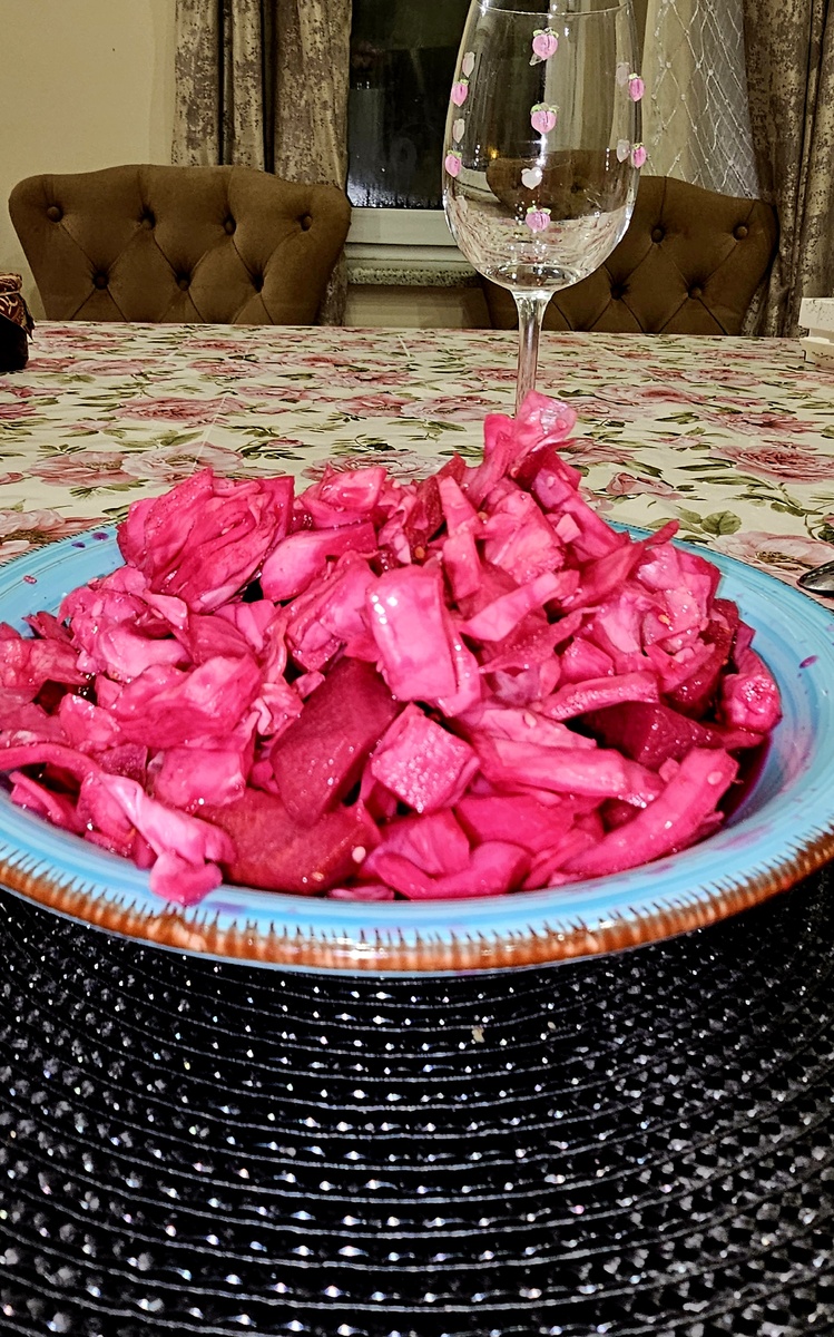 Капуста по-грузински, для любителей поострее ;) . Кисло- сладкая капуста с пикантными , пряными нотами кориандра. Эта капуста смотрится ярко, хорошо подходит как для праздничных застолий , так и для гарнира к мясным блюдам, курице, рыбе , винегрету, лобио, жареной картошке, пельменям и т.д на каждый день. Она идеальна на следующий день после праздничных застолий (эффект рассола) и для пикников к шашлыку (возьмите с собой в контейнере) , прекрасно хранится. Сделайте большую кастрюлю и Вам хватит на все новогодние праздники, у Вас всегда будет красивая закуска. Рецепт не классический, в классическом варианте, капуста солено -квашеная, она подается во всех грузинских ресторанах в качестве гарнира к шашлыку или в составе тарелки "Соленья(в нее обычно входят еще соленые огурцы, соленые зеленые помидоры, маринованный чеснок и т.д ". Я люблю оба варианта, этот вариант с более ярко выраженным кисловато-острым бодрящим , свежим вкусом такой капустно -свекольный бриз. Если сравнивать сол