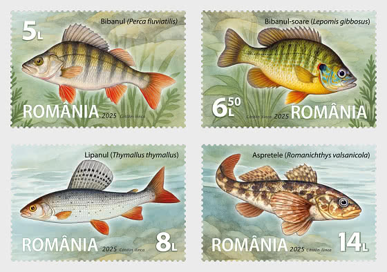 17 октября 2025 года, Romfilatelia и Poșta Română вводят в обращение выпуск почтовых марок на тему «Фауна» под общим названием «ВИДЫ РЫБ». Выпуск состоит из четырёх почтовых марок и конверта первого дня. Рыбы — известные живые существа, позвоночные, имеющие черепную коробку, обитающие в водной среде и дышащие растворённым в воде кислородом через жабры. Наука, изучающая рыб, называется ихтиологией. Тело рыб чаще всего имеет веретенообразную форму, гидродинамически устроенное, но может быть также сплющено в дорсовентральном (например, у сома) или латеральном (например, у морского конька) направлении или иметь различную форму (например, у морского конька). Оно может быть покрыто защитной чешуёй или костными пластинками кожного происхождения, или иметь жабры. Окраска рыб определяется хроматофорами – клетками под кожей, содержащими гранулы пигмента. Глаза рыб имеют полностью шаровидную форму; у большинства рыб век нет, но у некоторых имеется жировое веко (например, у скумбрии, кефали и т.д.
