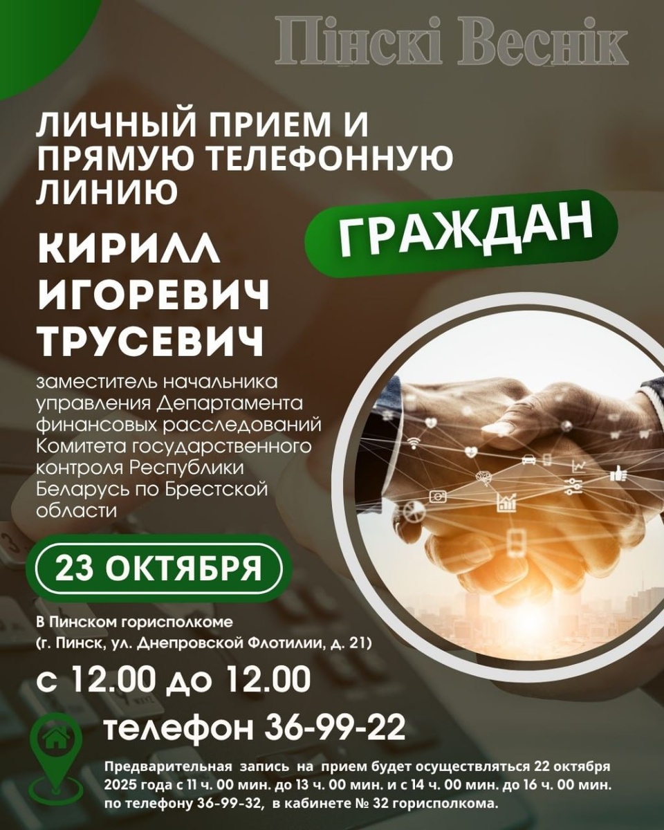 1️⃣1️⃣1️⃣6️⃣1️⃣ 4️⃣1️⃣1️⃣8️⃣5️⃣1️⃣1️⃣ ✅23 октября 2025 года в Пинском горисполкоме (г. Пинск, ул. Днепровской Флотилии, д. 21) ➡️с 12 ч. 00 мин. до 13 ч. 00 мин. будет проводить прямую телефонную линию по телефону 36-99-22 и личный прием граждан и представителей юридических лиц заместитель начальника управления Департамента финансовых расследований Комитета государственного контроля Республики Беларусь по Брестской области Трусевич Кирилл Игоревич с жителями г. Пинска по вопросам нарушений законодательства в сфере экономики, злоупотребления властью или служебными полномочиями со стороны должностных лиц ✏️Предварительная запись на прием будет осуществляться 22 октября 2025 года с 11 ч. 00 мин. до 13 ч. 00 мин. и с 14 ч. 00 мин. до 16 ч. 00 мин. по телефону 36-99-32, в кабинете № 32 горисполкома. 📍📍@Пинский Вестник 📱ЮТУБ 📱САЙТ 📱ИНСТ 📱ВК 📱ОК 📱ФЕ 📱TikTok 📱Прислать новость