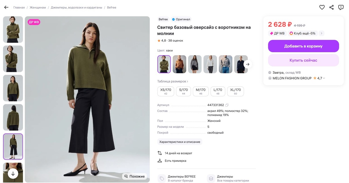 источником идей и хорошего настроения! Помню, как впервые примерила оверсайз-свитер: кажется, меня укутали в облако, что не хочется вылезать. Высокий воротник-стойка на молнии можно застегнуть до горла в ветреную погоду или распустить, сделав V-образный вырез, если хочется чуть-чуть кокетства. Ношу с узким низом и баланс мгновенно складывается: объем сверху + аккуратный низ = стиль без лишних усилий. Артикул 447331362 Однажды промозглым утром я поняла: перчатки не просто для тепла. Кожаные, с шелковистой подкладкой, они садятся по руке как вторая кожа и защищают от ветра и дождя до нуля градусов. Когда выходишь на улицу и ладони не дрожат, - настроение уже не падает. Маленькая ремарка: натуральная кожа может иметь легкие царапины - это не брак, а знак жизни материала. Артикул 200986012 Эти брюки 7/8 с резинкой на поясе дали мне ощущение уверенности: офисный сти
