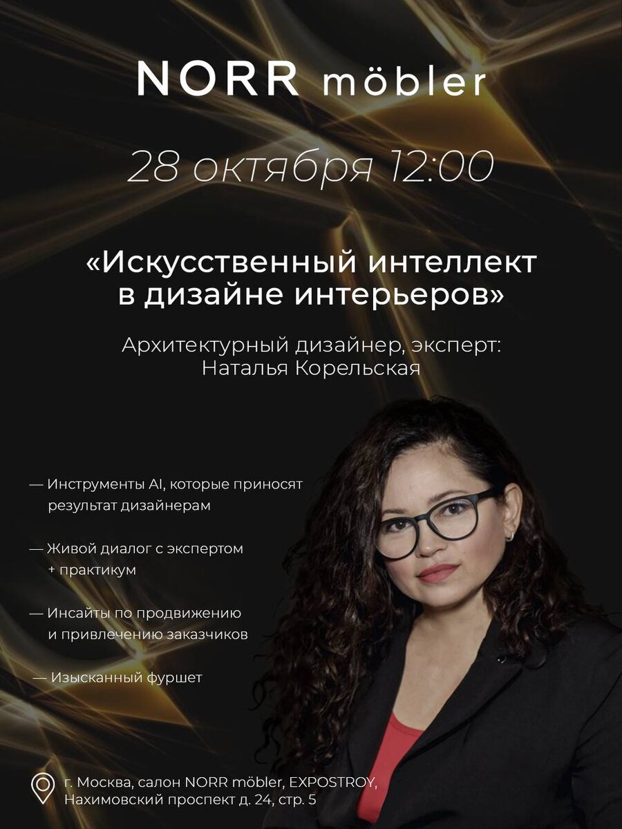 Лекция «Искусственный интеллект в дизайне интерьеров» от NORR möbler & Натальи Корельской ✨ В рамках мероприятия эксперт и спикер - Наталья Корельская расскажет о роли ИИ в современной творческой среде и проведет практическую часть, где каждый из участников вдохновится и найдет новые решения с помощью современных технологий! Кроме того, вас ждут: • полезные инсайты по продвижению и привлечению заказчиков, • атмосфера профессионального общения, • и, конечно, изысканный фуршет Дата и время: 28 октября 12:00 Сбор гостей: 11:30 Место проведения: г. Москва, салон NORR möbler, EXPOSTROY, Нахимовский проспект, д.24, стр.5 Для участия необходимо зарегистрироваться по ссылке 🖇️