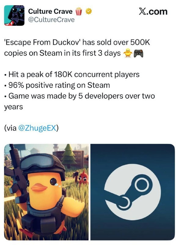 Пока аркадные игроки погружаются в новую Battlefield 6, истинные хардкорщики наслаждаются «Escape From Duckov». За первые три дня после релиза игра сумела: — продать 500 тысяч копий в Steam, — достичь пика в 180 тысяч одновременно играющих, — получить 96% положительных отзывов. Такой масштабный проект разработали всего пять человек за два года. Постмейкер - автоматическое ведение канала 🤖 Анимация | СhatGPT-4 | Помощь с резюме
