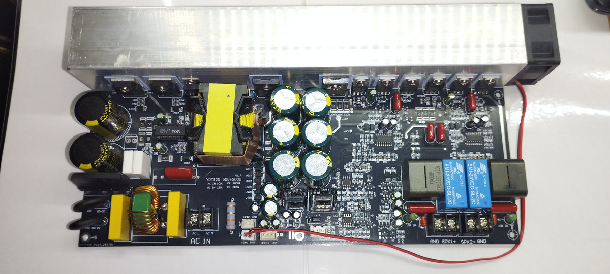 Друзья всем привет. Сегодня хочу поделится информацией об вот такой интересной плате усилителя мощности класса "D". Показать вам её параметры, характеристики которые мне удалось от неё получить. Плата пришла прямиком из страны, ну сами догадываетесь из какой. Плата двух канального усилителя мощности с блоком питания. Называется плата YD7120 500+500 W. С обратной стороны плата выглядит вот так В описании данного усилителя написано: Усилитель 500Wх2, цифровой аудиоусилитель Hi-Fi 2.0 стерео. Плата усилителя BTL моно 1000 W. Звуковой усилитель. Ну и естественно характеристики которые пишет производитель: Питание 220 вольт. Отношение сигнал шум 105 дБ. Частота воспроизведения звука от 20 Гц до 30 кГц. Входное сопротивление 47 кОм. Выходная мощность одного канала 500 ватт. Мостовое включение 1000 ватт на нагрузку 8 оМ. Осмотрим поверхностно плату, что здесь на ней имеется. Два усилителя мощности звуковой частоты класса "D". Все надписи на деталях хорошо читаются. Да и вообще плата изготовле