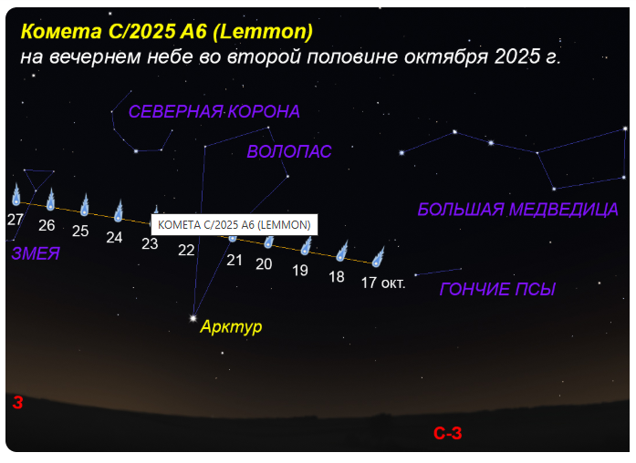 Комета C/2025 A6 (Lemmon) — главное украшение осени этого года и сейчас она отлично видна вечером, на западной стороне неба. В настоящий момент C/2025 A6 перемещается по созвездию Гончих Псов, затем 20 октября перейдёт в созвездие Волопаса, а ещё через 4 дня, 24 октября, окажется в правой части созвездия Змеи.