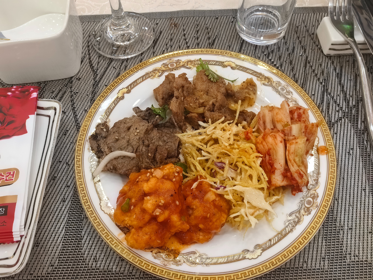Миф про голодных корейцев разбился сразу. Они хоть и худенькие (мяса явно всё ещё не хватает), но простых продуктов хватает всем с лихвой. А я так вообще за 4 дня наела в Пхеньяне лишний килограммчик! Каждый приём пищи нам подавали: Мы ели в банкетных ресторанах, но подача блюд всё ещё хромает. Местами было, как в наших столовках. При этом новые рестораны подают еду, как в наших кафе. То есть сильно зависит от места. Рис в Северной Корее - полноценное блюдо. Его всегда подавали перемешанным с чем-то и в конце трапезы. То есть в начале нам могли дать салаты с мясом, а в конце приносили рис. Для русских нелогично, конечно. Нас часто угощали супами-пюре. Из кукурузы, картофеля или грибов. Вкусно, но довольно жиденько. Суп приносили ближе к середине трапезы. В одном из рестораном подали пибимпаб - рис с салатиками. Было круто! Но в другой раз нас угостили холодной куксу и это было типичное не то. Какой-то новомодный северокорейский вариант куксы. В последний вечер пошли в ресторан с
