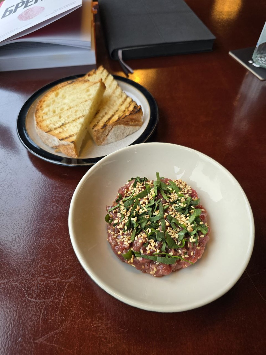 🍷Что такое гастрономическое многоточие? Это когда заведение говорит тебе всё, кроме главного. Ты слышишь шёпот ингредиентов, видишь намёки на гениальность, но финальная точка так и не ставится. Ты ждёшь откровения, а получаешь лишь симпатичный черновик. «Балкон» — именно такая рукопись. Талантливая, полная остроумных пометок на полях, но с трагическим отсутствием редактора. 1️⃣ Концепция: Обещание и реальность Концепция гриль-бара — самая простая из арифметик. Огонь, мясо, дым. Это язык, на котором говорят все. «Балкон» же пытается говорить на нём с поэтическими отступлениями. И на бумаге это смотрится блестяще. Атмосфера — безупречный союзник этой идеи: приятный интерьер, спокойный свет, вид на водоем, располагающий к неспешным беседам. Музыка тихо вторит общему настрою. Это декорации к пьесе, которую ты ещё не читал, но уже жаждешь увидеть. 2️⃣ Кухня — пьеса с гениальными актами и провальными репликами 🥩 Тартар из стейка фланк с трюфельным понзу. Мощный, уверенный пролог. Это тот р