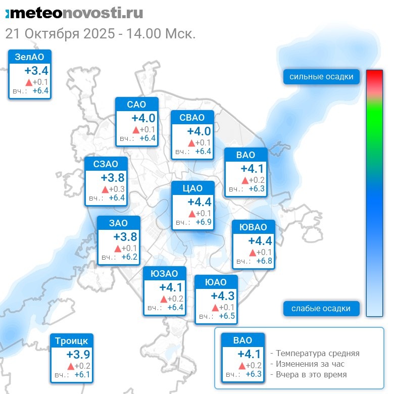 В 14:00 в Москве было от +3.2°C до +5°C, средняя температура +4.1°C #погода #Москва #осень #температура #21октября #вторник Перейти на сайт Прогноз погоды на 14 дней