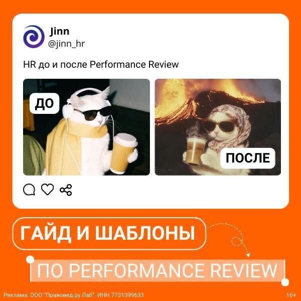 📬 Гайд с шаблонами по Performance Review Каждый раз одно и то же. Вы проводите Performance Review (PR): составляете анкеты, подбираете респондентов, собираете обратную связь, создаёте отчёты… А результаты никто не использует. То ли не верят в оценку, то ли просто лень. Тем не менее, PR даёт наиболее полное представление о том, насколько эффективно работает сотрудник и что ему необходимо для дальнейшего развития. 📌 Делимся гайдом по Performance Review — https://clck.ru/3PrCjK. Внутри найдёте не только информацию о том, как эффективно провести оценку и не допустить самые распространённые ошибки, но и шаблоны опроса и отчёта, а также планов развития. Реклама. ООО «Правовед.ру Лаб». ИНН 7731399633