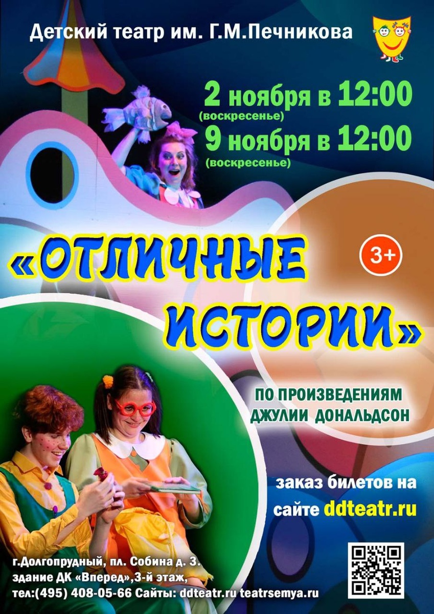 🎭 Ура! Билеты на спектакль «Отличные истории» уже в продаже! 🎉 Дорогие друзья! Пришло время для волшебства! Детский театр им. Печникова приглашает юных зрителей и их родителей на добрый и красочный спектакль «Отличные истории», поставленный по произведениям знаменитой детской писательницы Джулии Дональдсон! Погрузитесь в мир неиссякаемого добра, юмора и удивительных приключений, где яркие декорации и забавные герои создают настоящую сказку на сцене.☀️ 🗓 Даты спектаклей: 2 ноября(воскресенье) в 12:00 9 ноября(воскресенье) в 12:00 👧🧒 Рекомендуем для детей от 3 лет 🕑 Продолжительность - 1 час 📍 г. Долгопрудный, пл. Собина, д. 3, ДК «Вперед», 3-й этаж, ДТШ «Семь Я» Не упустите возможность подарить своему ребенку праздник!💚 🎟 Билеты уже ждут вас на нашем сайте: https://ddteatr.ru/ или по ссылке: https://iframeab-pre5847.intickets.ru/ #театрдолгопрудный #отличныеистории