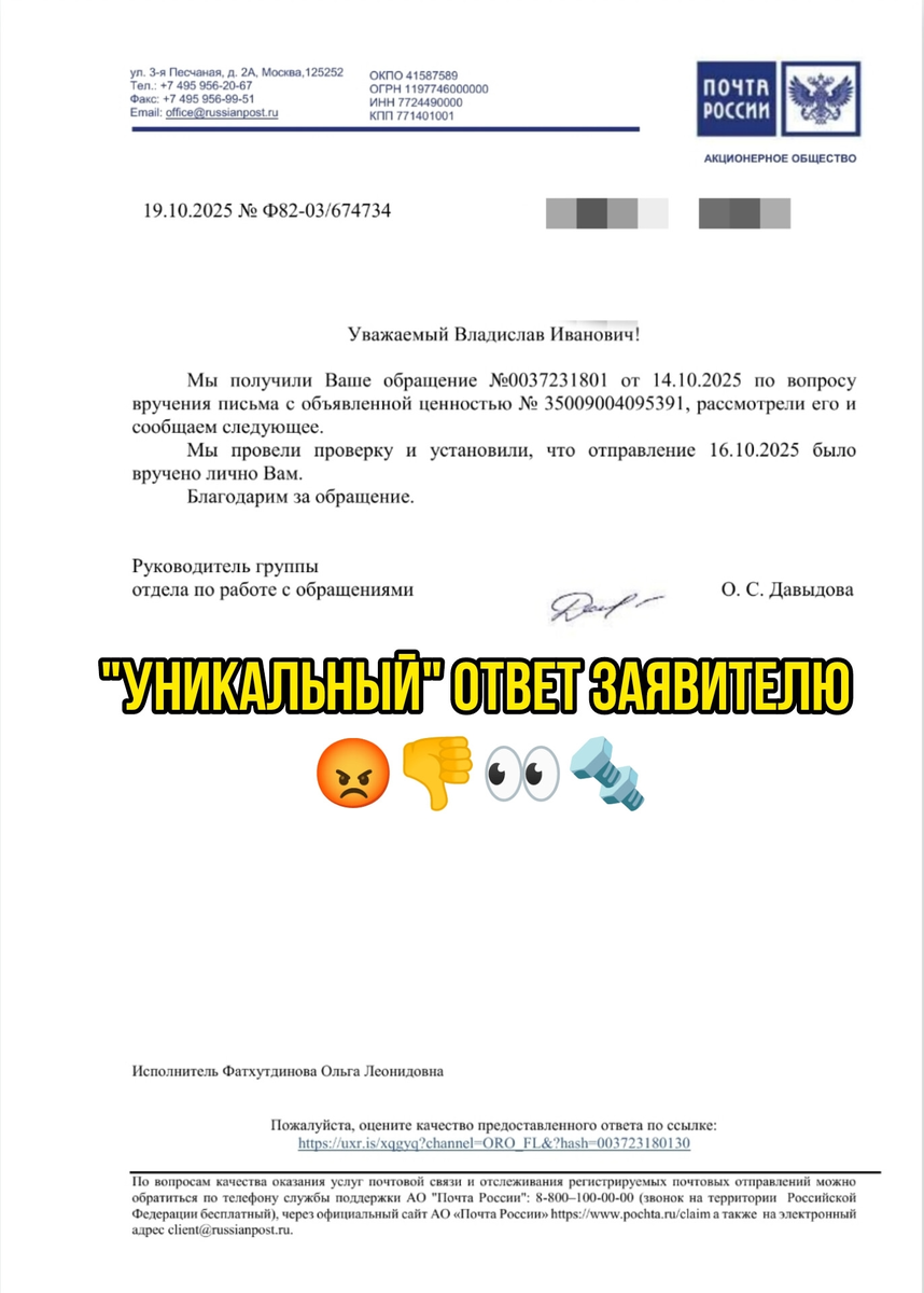 20.10.2025 я получил официальный ответ за подписью руководителя группы О.С. Давыдовой (исх. № D82-03/674734 от 19.10.2025), который является образцом бюрократического цинизма и формализма.