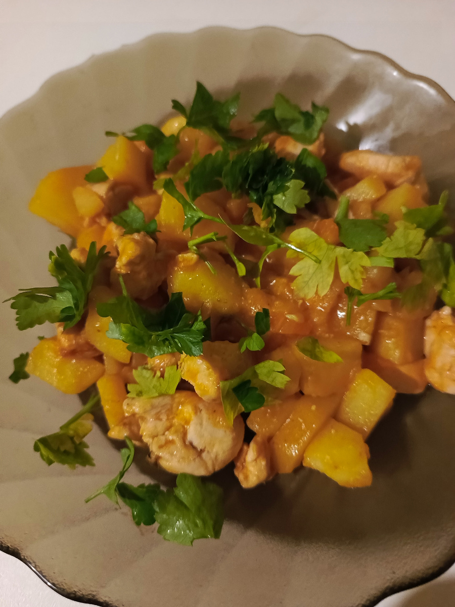 Нарезаем любое мясо, картофель, морковь и чеснок. Добавляем специи для мяса, соль, перец, лавровый лист и немного томатной пасты, смешанной с водой. Все ставим тушится на огонь. Тушим до готовности мяса и овощей. Готовое блюдо посыпаем зеленью.