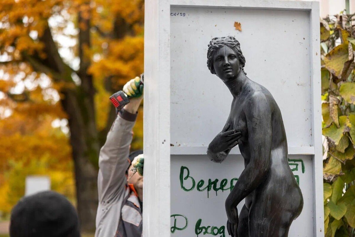 Ежегодно перед окончанием сезона проводится тщательная подготовка скульптурных композиций к предстоящей зимовке, сообщили сегодня в пресс-службе Государственного музея-заповедника «Петергоф». «Процесс включает очистку поверхностей специальными составами, предназначенными для удаления солевых отложений и загрязнений, накопившихся за лето, – говорится в сообщении. – Затем скульптуру бережно укрывают коробами, обеспечивающими надежную защиту до следующего года». Ранее «Петербургский дневник» сообщал, что в Петербурге укрывают скульптуры Летнего сада.