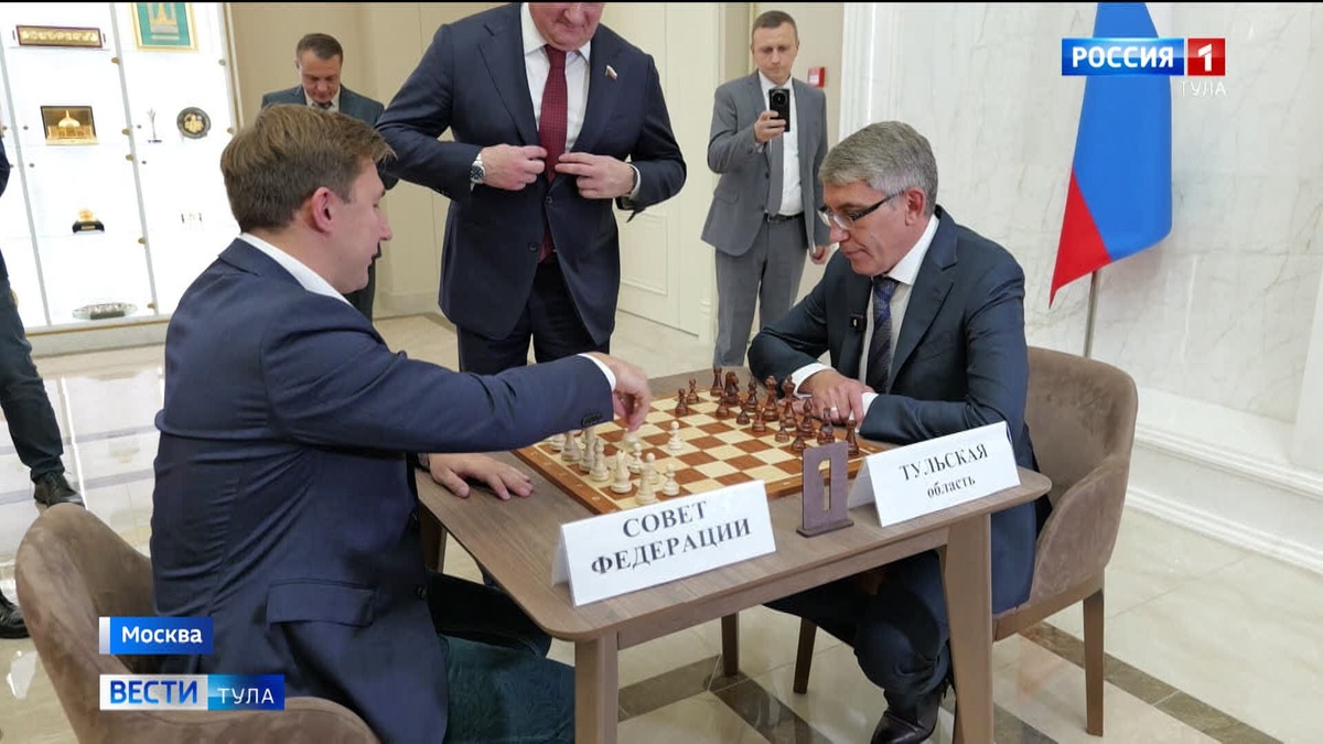 За шахматной доской — обладатель Кубка мира Сергей Карякин и губернатор Тульской области Дмитрий Миляев. В Совете Федерации стартовали Дни Тульской области. Мы находимся в верхней палате Российского Парламента — Совете Федерации, а вот это — та самая, знаменитая аллея флагов, где представлены символы всех субъектов нашей огромной страны. Вот он, флаг Тульской области, к которой в эти дни здесь особое внимание, ведь сегодня в Сенате стартовали дни нашего региона. Все эти три дня в Совете Федерации проходит выставка Тульской области, где особо ярко представлены достижения нашего региона. И все эти дни члены правительства Тульской области, депутаты Тульской областной Думы, представители палаты молодых законодателей при Совете Федерации, а также участники специальной военной операции во главе с губернатором Дмитрием Миляевым принимают участие в деловой повестке. Также состоялись соревнования среди команд сборной Совета Федерации и сборной Правительства Тульской области по шахматам. В турни
