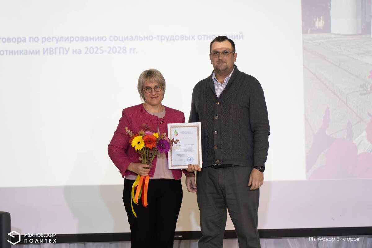 Символично завершил конференцию торжественный момент вручения благодарности от председателя Ивановской областной организации Общероссийского Профсоюза образования, депутата Государственной думы Виктора Смирнова, которой отметил заслуги ректора ИВГПУ Елены Никифоровой в деле развития социального партнерства.
