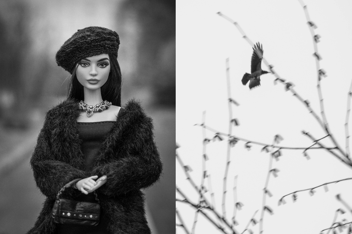 Пасмурное октябрьское утро, туман - это повод для веселой фотопрогулки. Я позвала Юлю "быстренько фотографировать". К счастью, Юля согласилась. Туман, правда, не стал нас дожидаться))) Фотографировали то, что было. На этой сьемке я в идеале бы хотела видеть куклу с темными волосами и светлым скинтоном (мрачнятинка, близится хэллоуин и всё такое). Но времени не было, а Лина Дивали уже была одета в черное платье. Тем более при чб обработке все очень даже получилось. На Лине трикотажное платье Леи бэйсик, сапоги Клодетт, берет и колье от Юли @dollect , сумочка с али и сшитый мной кардиган. Детали локации в такую погоду выглядели очень атмосферными. Другие фото с этой прогулки в цвете выложу в следующей статье. Лина прекрасна и в том, и в другом варианте)))