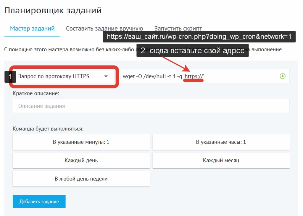 https://bot.troshin-tools.ru/wp-cron.php?doing_wp_cron&network=1 Обратите внимание, что адрес прописывается между одинарными кавычками В итоге у вас должна получится следующая запись wget -O /dev/null -t 1 -q 'https://bot.troshin-tools.ru/wp-cron.php?doing_wp_cron&network=1' Дальше настраивается как часто запускать проверку Cron заданий в вашем вордпрессе.
