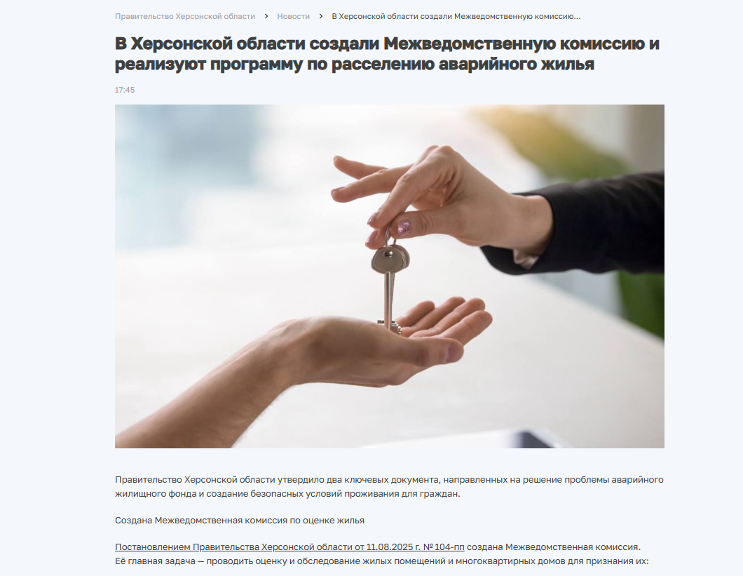Программу растянули на пять лет — с 2025 по 2030 год. Проблема ветхого и аварийного жилья для юга области — не новая. Множество домов десятилетиями стоят без капитального ремонта, теряя прочность и представляя угрозу для жителей. Теперь в регионе утверждена пятилетняя программа, которая должна изменить ситуацию. Власти региона официально утвердили документ (Постановление Правительства Херсонской области от 11.08.2025 г. № 104-пп), который показал путь к решению проблемы аварийного жилья. Одновременно создана межведомственная комиссия, которая займётся обследованием домов и оценкой их состояния. Комиссия будет определять, пригоден ли дом для проживания или подлежит сносу, и принимать решения на основании заявлений собственников и органов местного самоуправления. Первый этап программы продлится до конца 2026 года. В этот период планируется переселить 59 жителей десяти многоквартирных домов, признанных аварийными. Общая площадь жилья под расселение — около 1650 квадратных метров. На первы