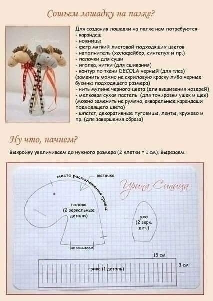 Не бойтесь: чтобы сшить такую лошадку, достаточно элементарных навыков в рукоделии. И можно обойтись без швейной машинки - шить немного, можно и вручную. А лошадка получается очень симпатичной. Мне очень нравится, что она на палочке: хоть в бокал ставь, хоть в новогодний салат втыкай. Можно без палочки - сверху петельку пришить и на ёлку повесить. И поярче материал выбирайте, ведь 2026 год будет годом Огненной Лошади. Моя лошадка бледненькая получилась. Выбрала я эту ткань, потому что у нее кромка мохнатая, не пришлось отдельно гриву делать. Выкройку я нашла в интернете: Вся закавыка в шитье лошадки - только в аккуратном прошивании изгиба под шеей. Там надо на швы оставлять минимальную ширину или делать надсечки на ткани, чтобы это место хорошо вывернулось на лицевую сторону. На своей лошадке я краевую полоску пустила вдоль линии гривы. Прошила две детали вместе швом наружу - получилась грива. Впрочем, не заморачивайтесь - нарезанную из полоски ткани гриву пришить поверх готовой лошад