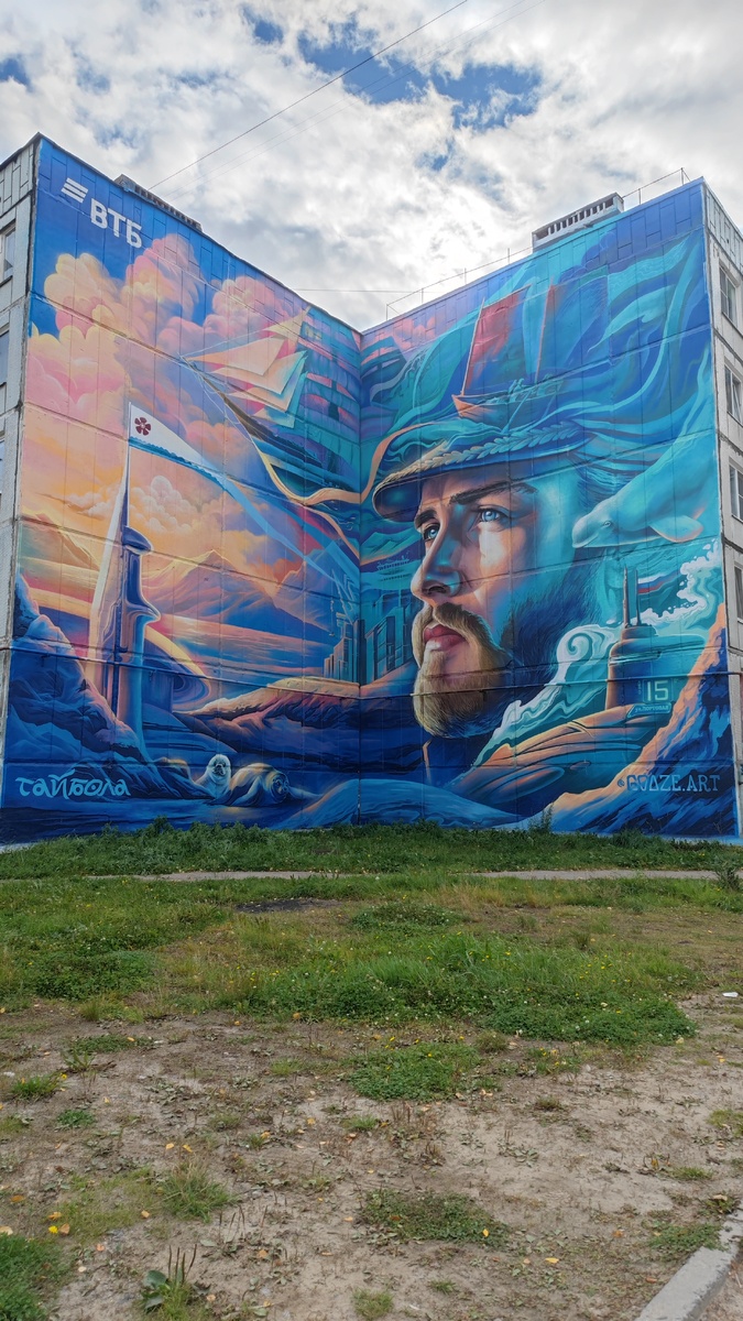 Фото 1 — «Капитан» (Портовая, 15 и 17). Появился этим летом. Выглядит как портрет поколения «я буду строить корабли и петь о будущем» — и вообще глядит в светлое будущее Северодвинска. В работе куча отсылок к кораблестроению: капитан, карбас, парусник, субмарина и силуэт ледокола. Автор эскиза и росписи — краснодарец Георгий Куринов (Gooze Art), тот самый, что уже делал «Маяк» и «Гармонию» в городе.